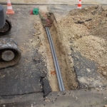 Réseau en tube PVC diam 10 CR8, calé au gravier 2/6 et signalé par un grillage avertisseur et réalisation d’un bouchon de visite sur chaque reprise.